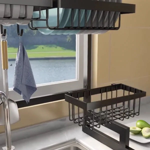 Овој иновативен држач е дизајниран да се поставува вертикално над кујнскиот мијалник, користејќи го неискористениот простор.