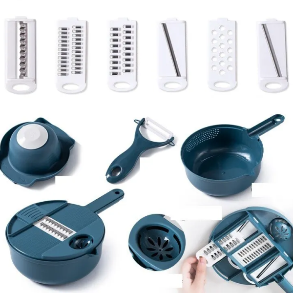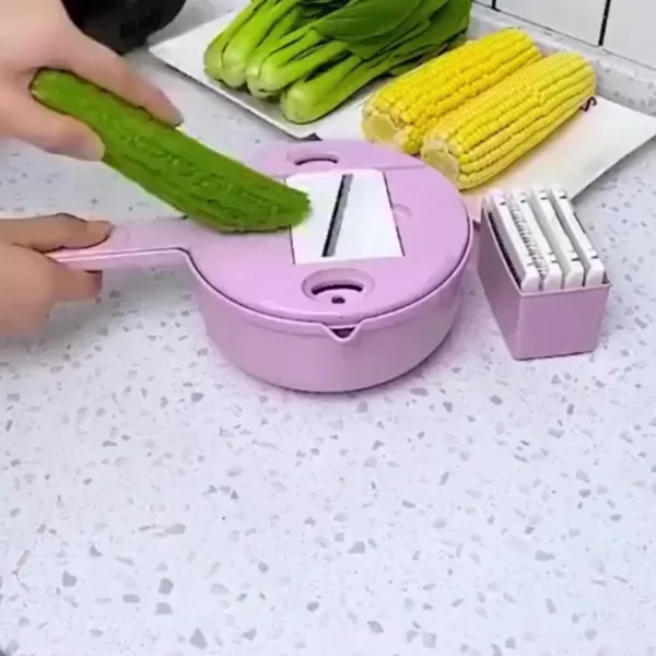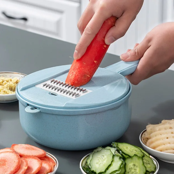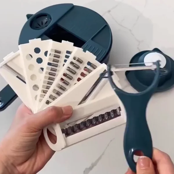 Повеќе намени во едно: Доаѓа со различни сечила кои ви овозможуваат да сечкате на коцки, ленти (жилиен), тенки кришки или да рендате со различна дебелина.