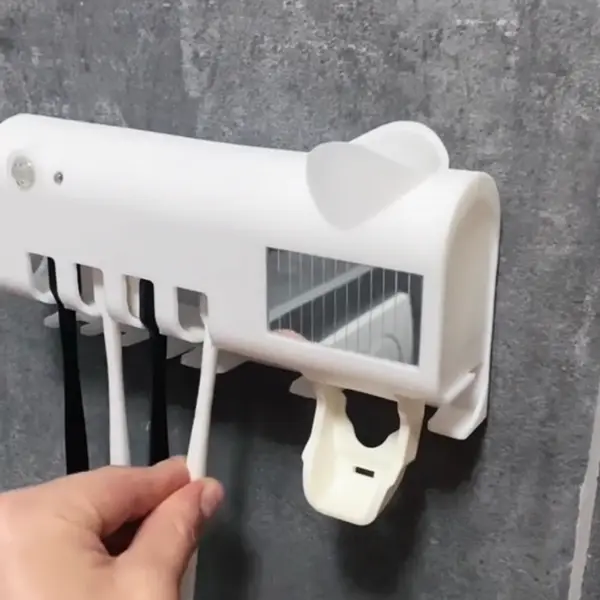 Со CleanSmile, добивате комбиниран уред кој решава два проблеми. УВ Стерилизаторот користи моќна UV-C светлина за да ги уништи бактериите и микроорганизмите кои се собираат на влакната на четките, обезбедувајќи дека секој пат кога ќе ја користите, таа е чиста и хигиенска. Диспензерот за паста ви овозможува автоматско и прецизно дозирање на пастата директно на четката со едно притискање, што спречува отпад и го елиминира нередот од тубичките. Уредот обично има држачи за повеќе четки и се монтира на ѕид со лепак или вакуум, без дупчење.